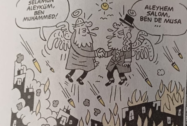 Într-o copie a imaginii în alb şi negru publicată pe reţele de socializare, profetul Mahomed şi Moise se prezintă unul altuia şi-şi dau mâna, în cerul unui oraş bombardat.