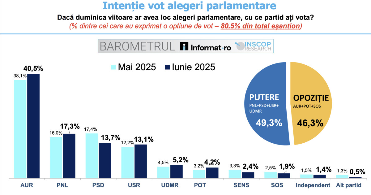Raportat la cei care au exprimat preferința pentru un partid din listă, indiferent dacă declară că s-ar duce sau nu sigur vot (80.5% din total eșantion), 40.5% dintre alegători ar vota cu AUR (față de 38.1% în mai 2025), 17.3% cu PNL (față de 16% în mai 2025), 13.7% cu PSD (față de 17.4% în mai 2025), iar 13.1% cu USR (față de 12.2% în mai 2025).